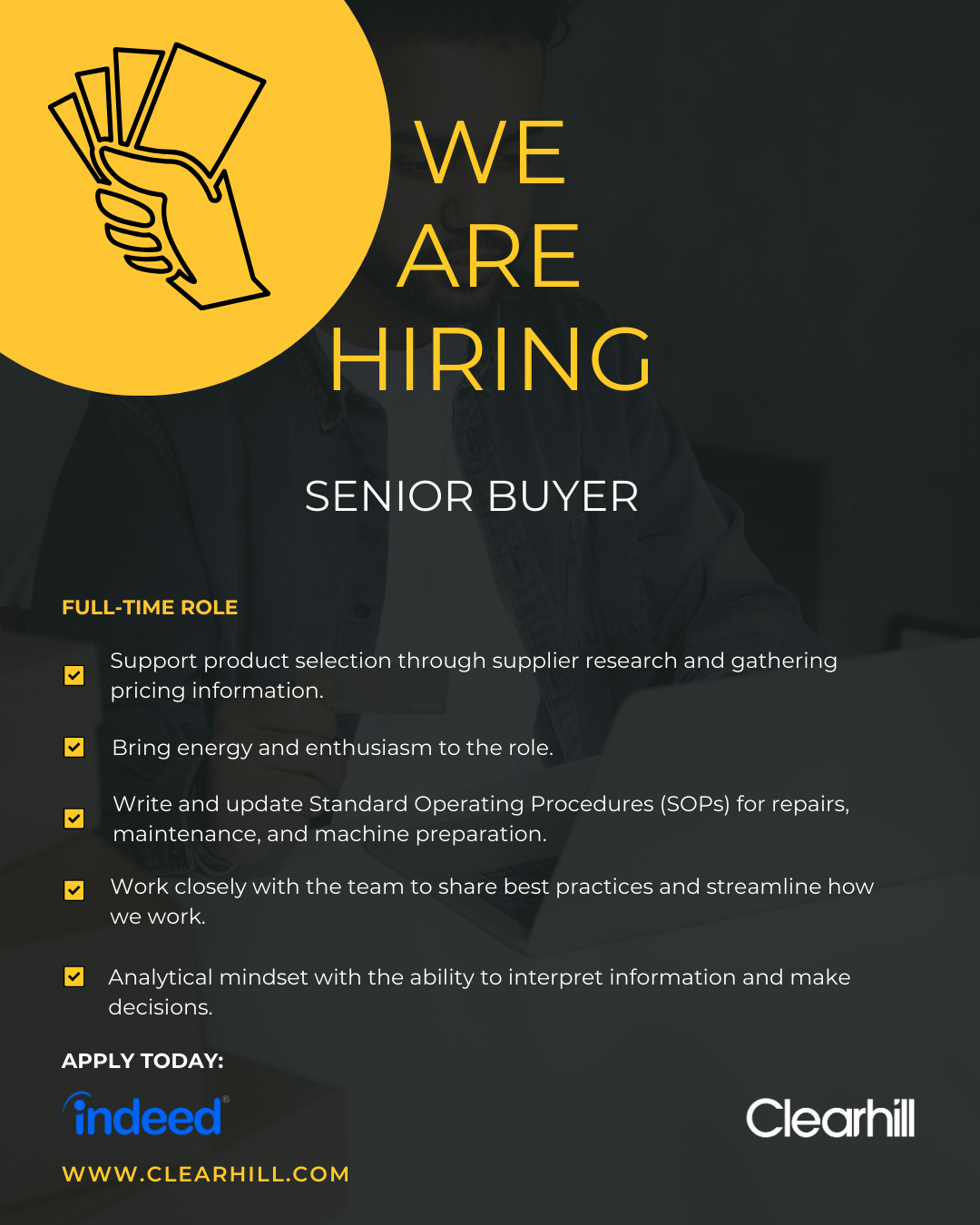 Full job description Hey! We’re Clearhill and we’re pleased to meet you! We’re going to start by talking about our exciting Senior Buyer position, but