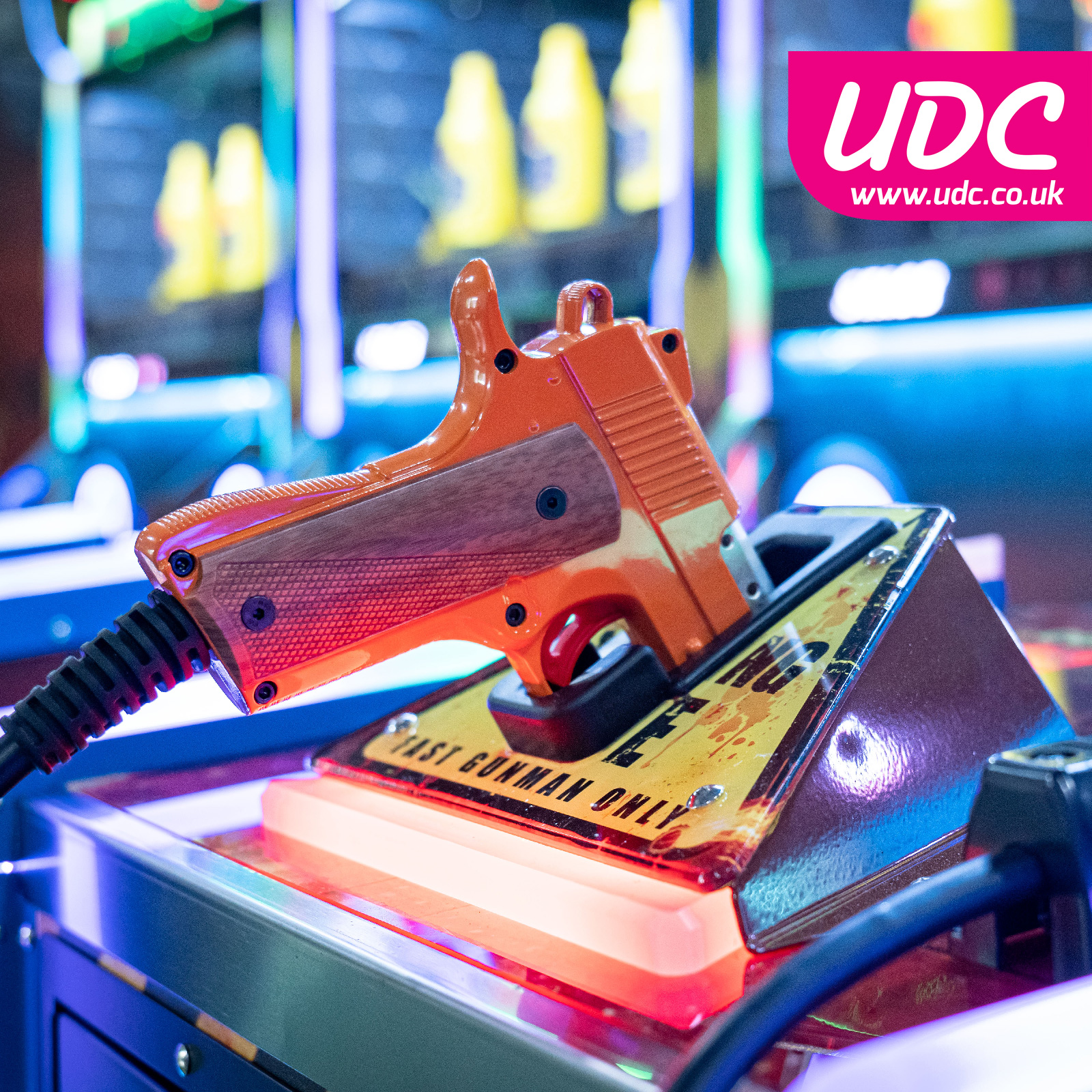 Single player light-gun shooting game. Aim at the lit-up bottles and shoot them down. Use the red-laser sight when you shoot to gauge your shooting accuracy.